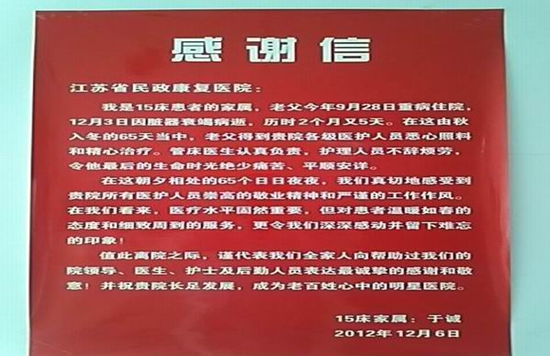 我是15床患者的家属.老父今年9月28日重病住院,12月3日因脏器官衰竭病逝.历时2个月又5天.在由秋入冬的65天当中,老父得到贵院各级医护人员悉心照料和精心治疗.管床医生认真负责,护理人员不辞烦劳.令他最后的生命时光减少痛苦,平顺安详.