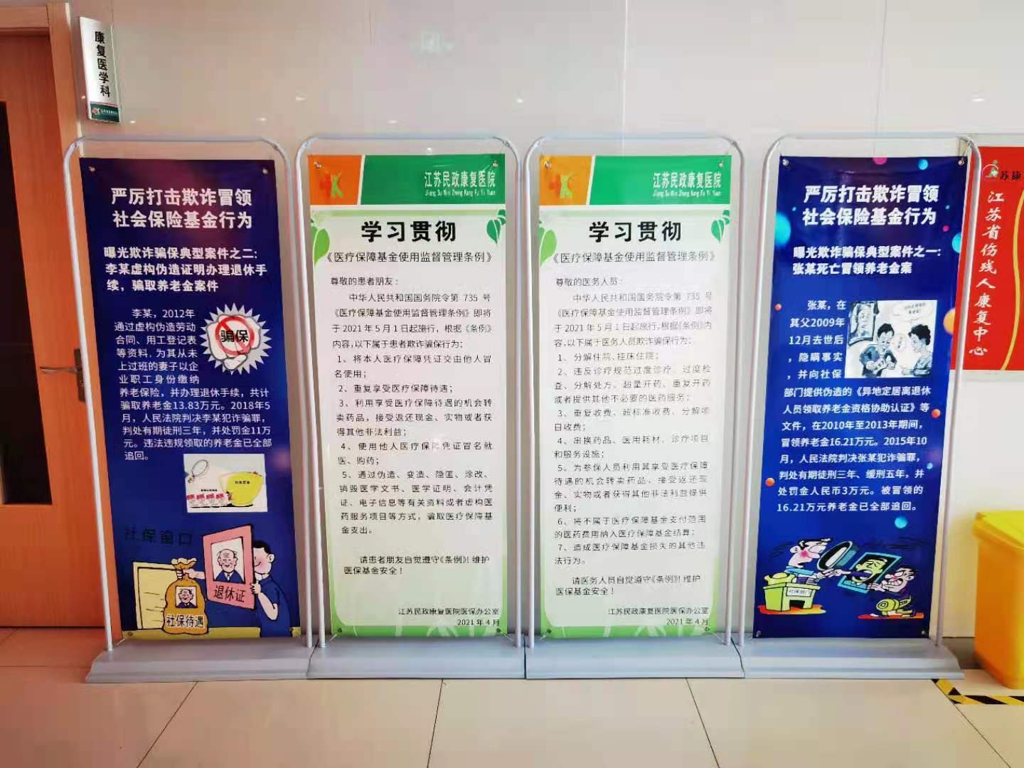 会后,医保办组织人员深入挂号收费处、门诊、病区等人群密集场所和醒目位置张贴宣传图、悬挂横幅,发放《条例》相关宣传资料,利用电子显示屏流动播放“严厉打击欺诈骗保行为,坚决维护医保基金安全”等标语,旨在通过各种形式的宣传活动,强化全院职工和参保人员法治意识。