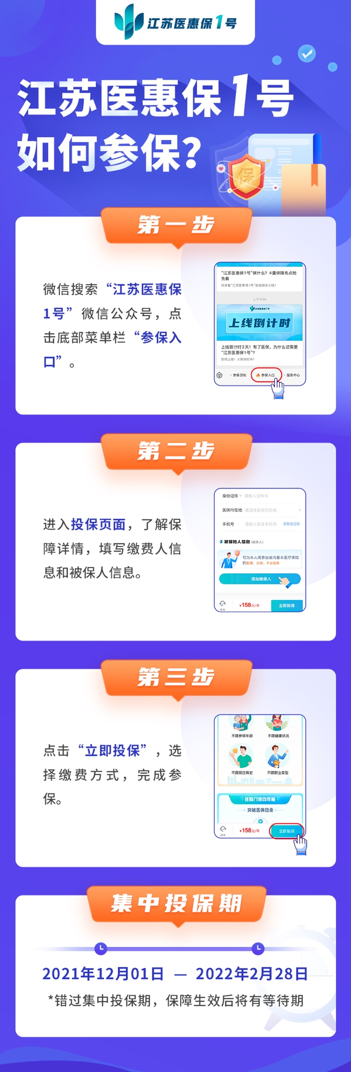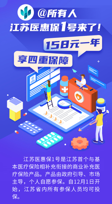 为了切实提升全省参保人员的医疗保障水平,特别是有效缓解重大疾病患者家庭“因病致贫、因病返贫”等难题,2021年12月1日,在江苏省医疗保障局指导、中国银行保险监督管理委员会江苏监管局监督下, “江苏医惠保1号”正式上线。