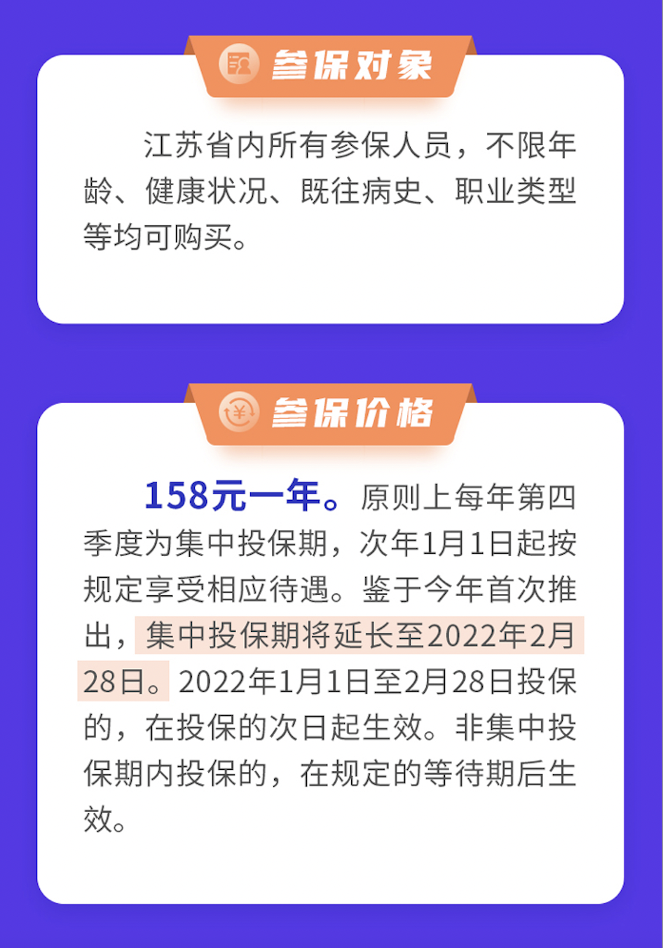 “江苏医惠保1号”与基本医疗保险有效衔接,面向我省所有参保人员,不限参保年龄、健康状况、既往病史、职业类型等,均可以投保。保费为158元/人/年,价格普惠适宜,为广大患者带来福音。