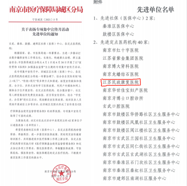 全院医务人员严格执行各项医保政策,加大内部督查,增强自律意识,规范诊疗行为,通过签订医院法定代表人和医保医师防范欺诈骗保承诺书,进一步增强全院医务人员维护医保基金安全的自觉性和主动性。2021年4月,南京市医保局城区分局开展以“宣传贯彻《条例》加强基金监管”为主题的专项集中宣传月活动,我院在此次活动中表现突出,得到南京市医保局城区分局的书面通报表扬。6月份,我院在城区范围内第一个通过国家编码贯标工作,在城区所有的二级医疗机构中起到了很好地示范带头作用。